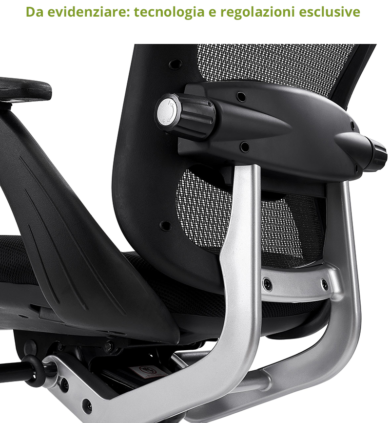 La tecnologia avanzata del suo meccanismo sincronizzato con 5 posizioni di blocco offre un'esperienza di seduta unica, che distingue i modelli di alta gamma. Potrai reclinare la sedia e lasciarla fissa nella posizione desiderata, in modo da offrirti un'ampia libertà di movimento. Come avrai potuto notare, persino il design del meccanismo è stato accurattamente pensato.