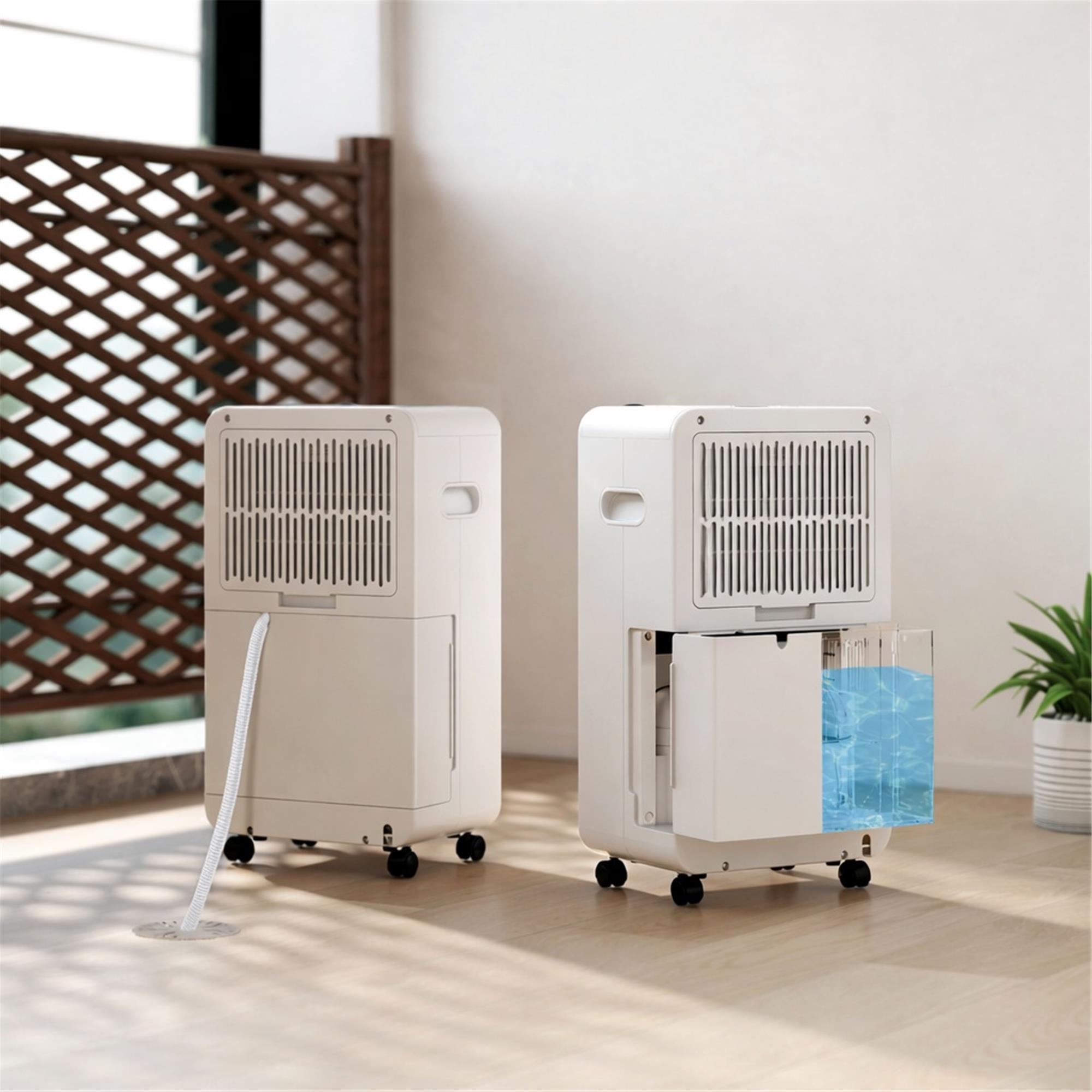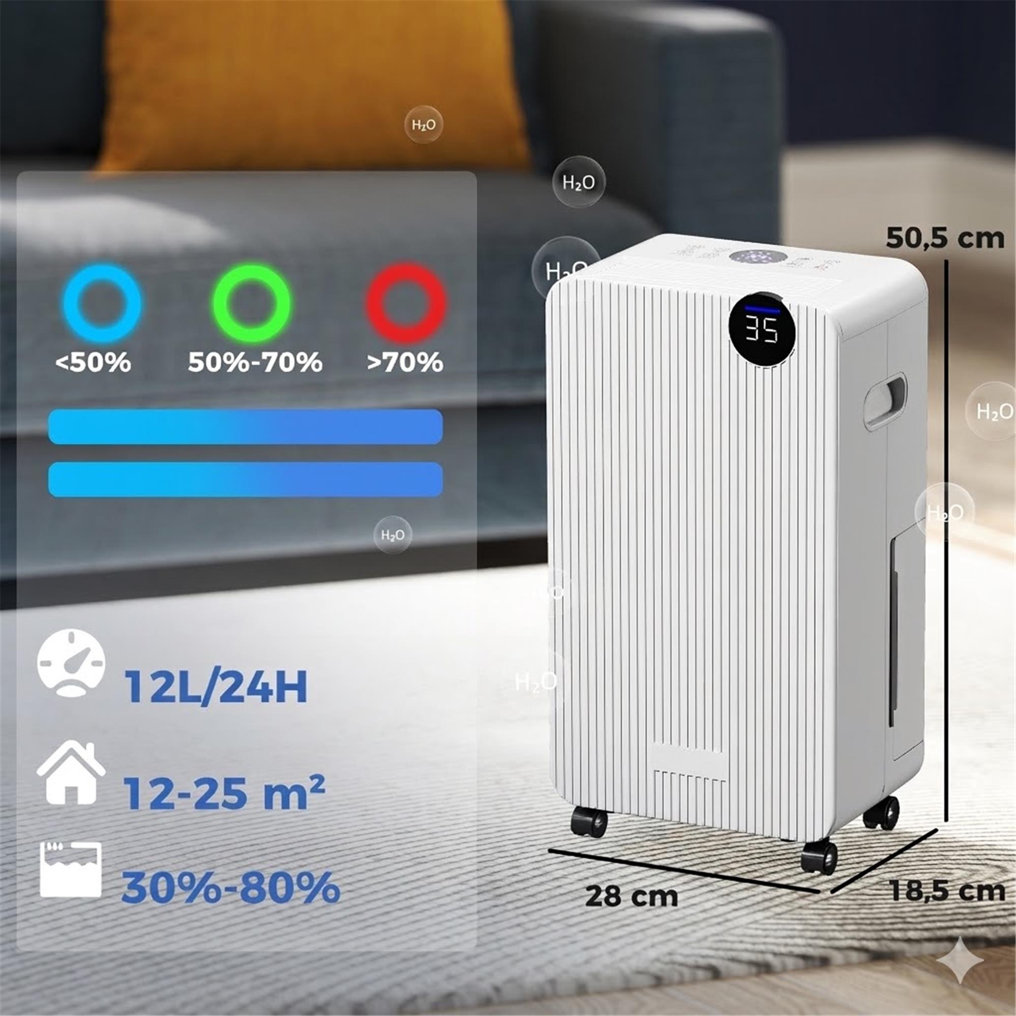 Questo deumidificatore è provvisto di ruote girevoli e maniglia per spostarlo facilmente, è realizzato in ABS resistente ed è dotato di un cavo da 1,8m per facilitare l'installazione. Funziona con alimentazione a 220-240V/50Hz, ha una potenza di 300W e funziona in modo ottimale a temperature comprese tra 5 e 32 °C, garantendo prestazioni affidabili nell'uso quotidiano.