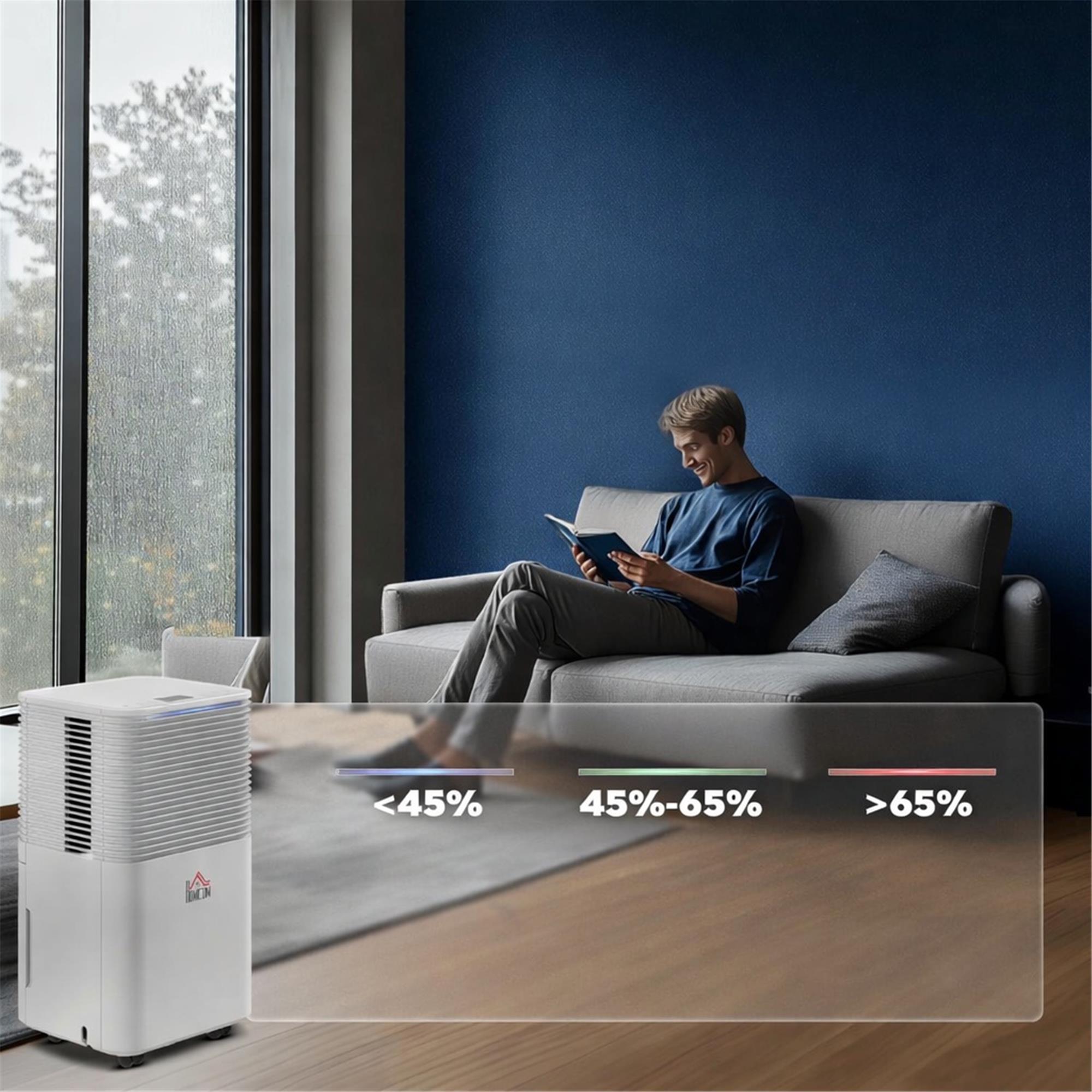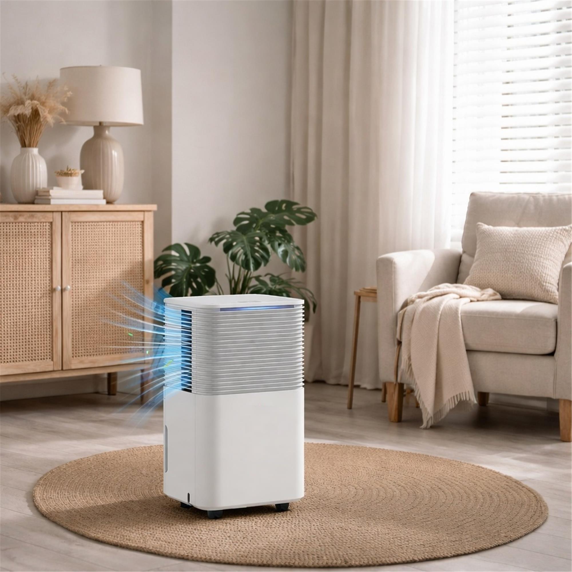 Questo deumidificatore è provvisto di ruote girevoli e maniglia per spostarlo facilmente, è realizzato in ABS resistente ed è dotato di un cavo da 1,5m per facilitare l'installazione. Funziona con alimentazione a 220-240V/50Hz, ha una potenza di 195W e funziona in modo ottimale a temperature comprese tra 5 e 35 °C, garantendo prestazioni affidabili nell'uso quotidiano.