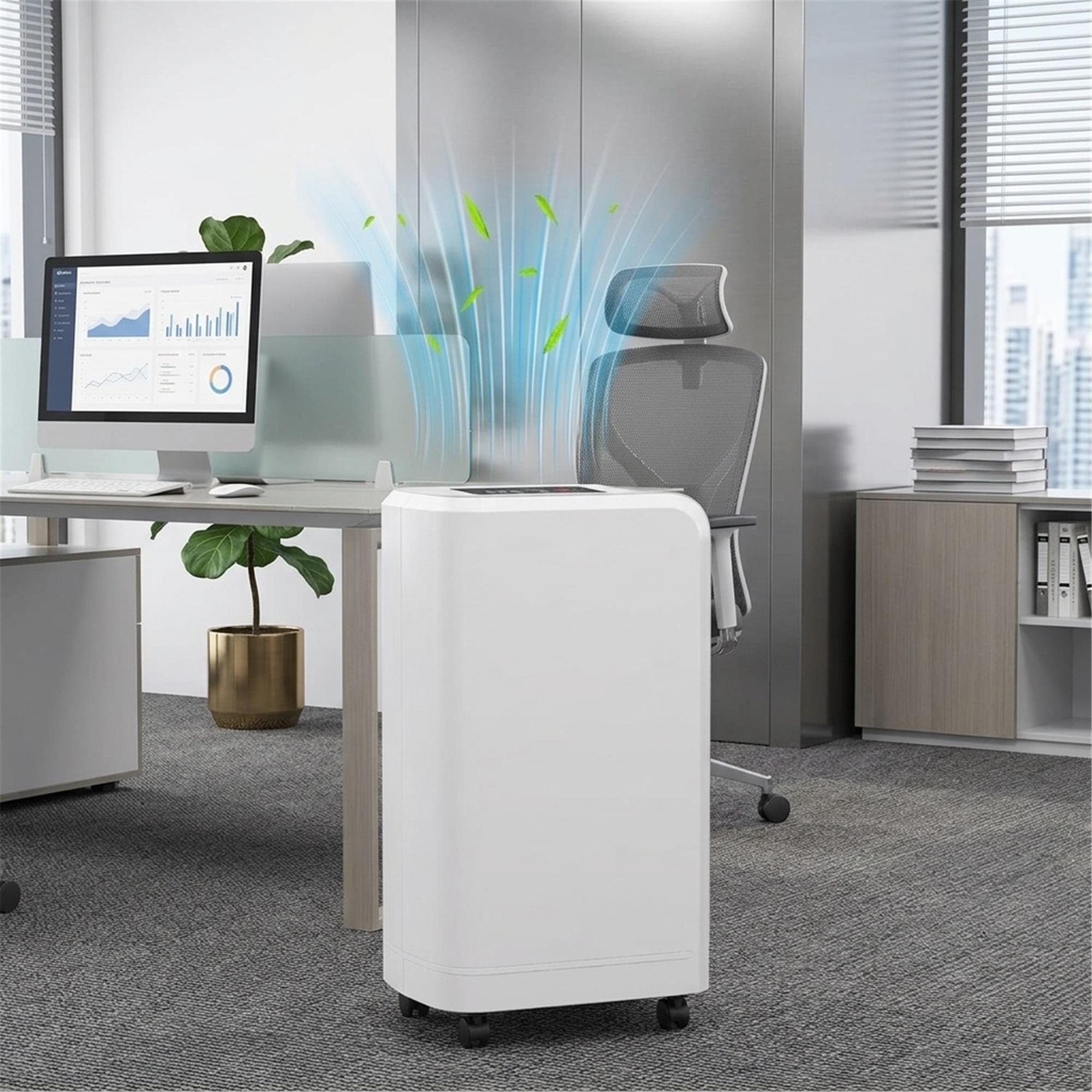 Deumidificatore per ufficio DRYSMART, modello compatto e dal design essenziale, pensato per integrarsi perfettamente in qualsiasi ambiente lavorativo. Elimina l'umidità in eccesso e previene la formazione di condensa, garantendo un'aria sempre fresca e salutare durante il lavoro. Grazie alle sue dimensioni ridotte, occupa il minimo spazio offrendo la massima efficienza energetica.
