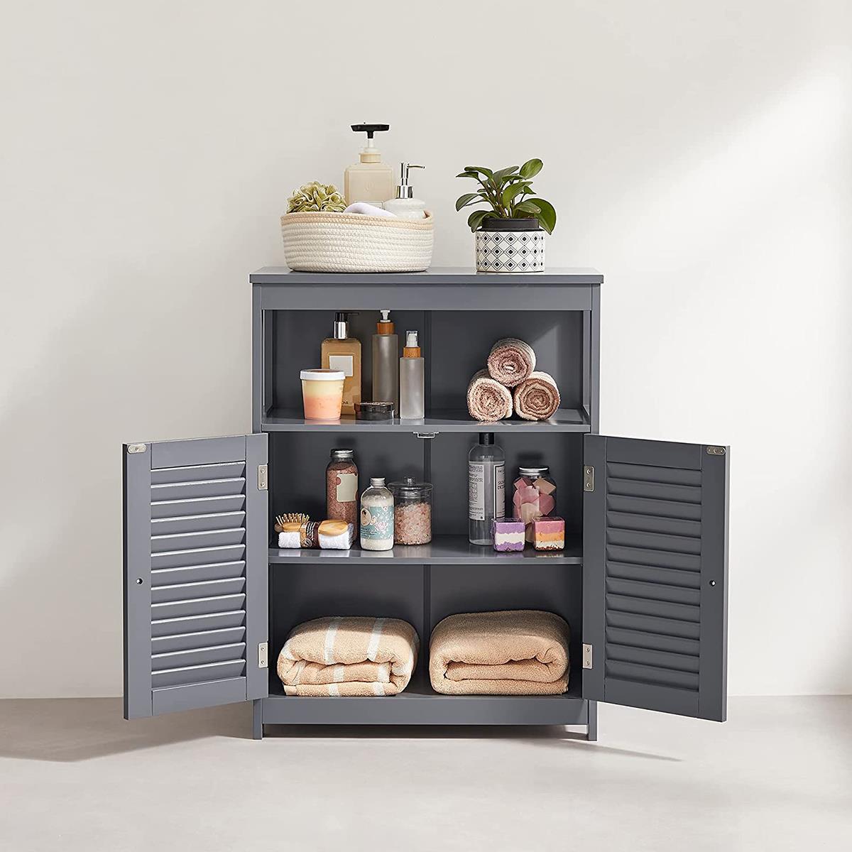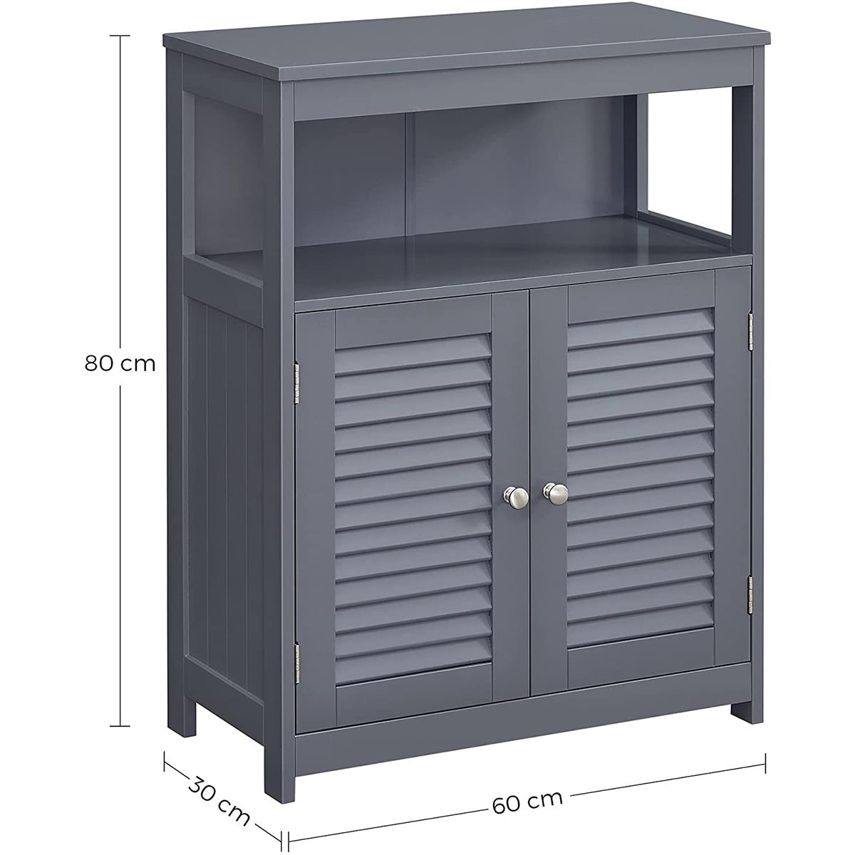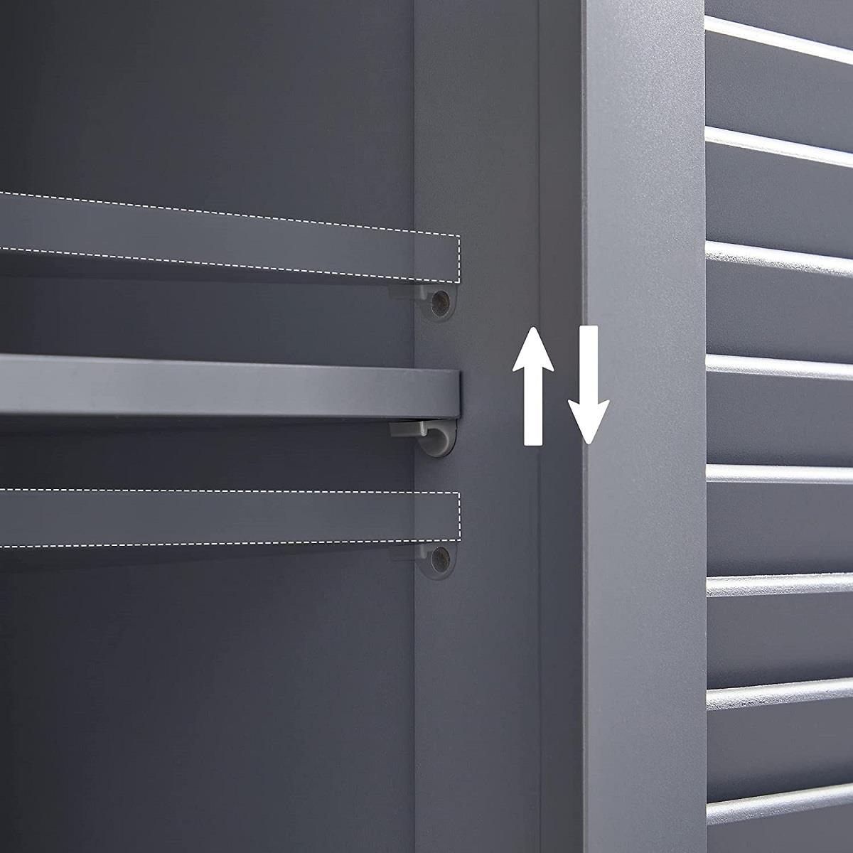 L'armadietto ha due ante con motivo a persiana utili e decorative. Le ante si possono facilmente aprire con le maniglie in metallo cromato. Il ripiano presente all'interno delle ante è posizionabile su tre diverse altezze così da poter personalizzare lo spazio in base alle proprie esigenze.