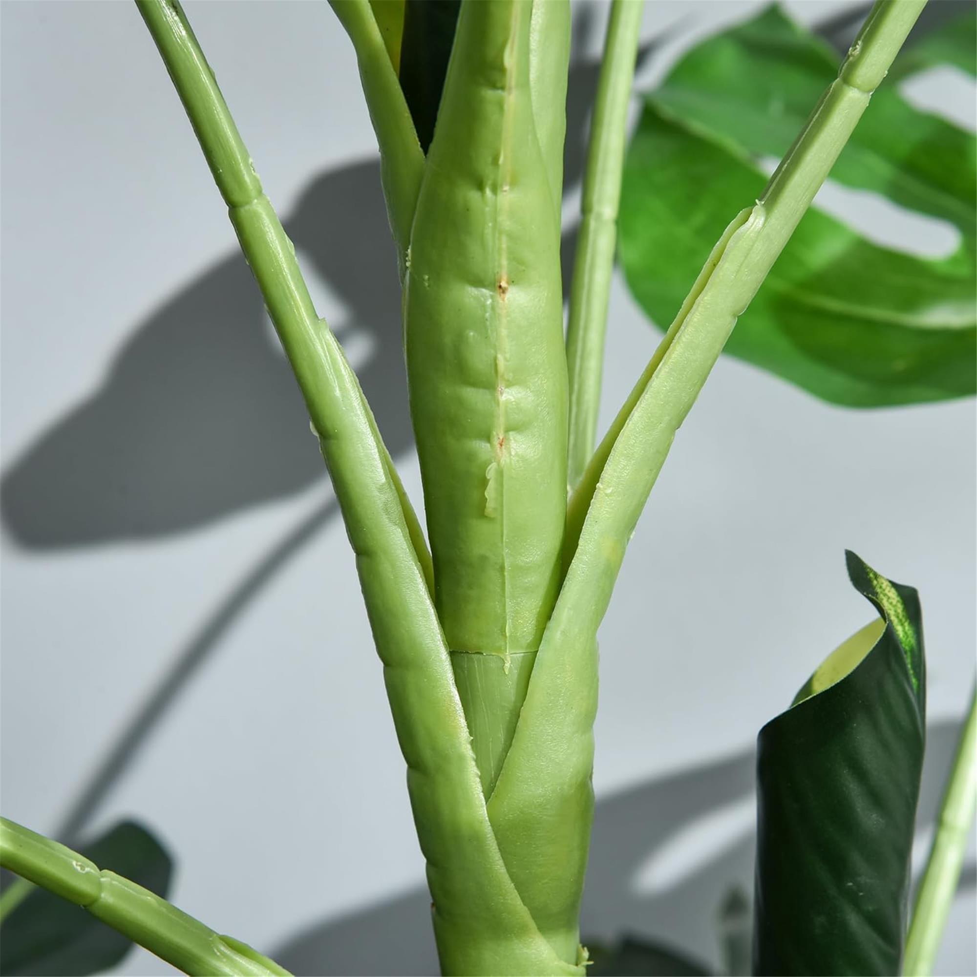 La pianta è realizzata con 21 foglie ampie e frastagliate, caratterizzate dalle iconiche fenestrature tipiche della specie. Ogni foglia presenta venature dettagliate e sfumature di verde naturale. I tre fusti principali, dalla texture robusta e variegata, conferiscono alla struttura un aspetto solido e autentico, rendendola quasi indistinguibile da un esemplare vero a un primo sguardo.