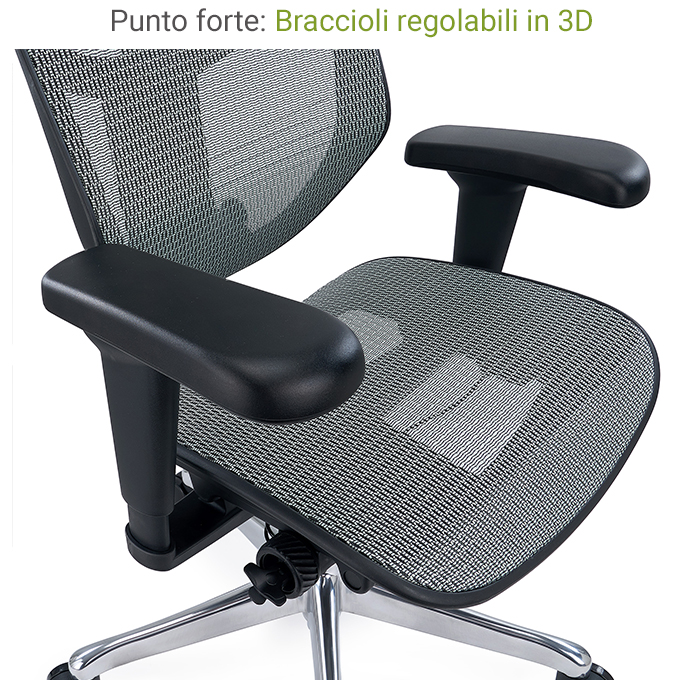 Il sedile è regolabile in profondità ed è ampio e con i bordi arrotondati e ha ben 10 zone a pressione differente così da adattarsi perfettamente all'utente.  Il rivestimento di tutta la seduta è realizzato in tessuto a rete molto resistente e di facile pulizia. Questo materiale assicura una seduta comoda ma sostenuta favorendo una corretta postura anche dopo un utilizzo di molte ore consecutive.