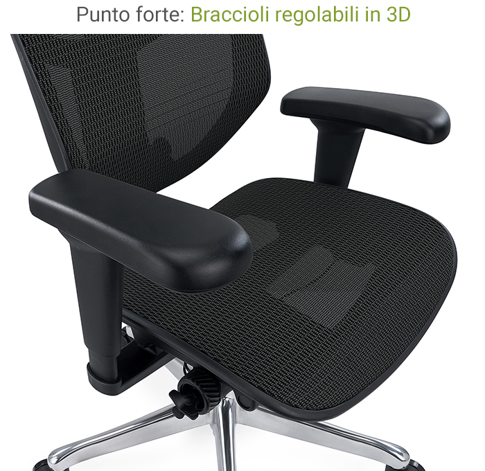 Il sedile è regolabile in profondità ed è ampio e con i bordi arrotondati e ha ben 10 zone a pressione differente così da adattarsi perfettamente all'utente. Il rivestimento di tutta la seduta è realizzato in tessuto a rete molto resistente e di facile pulizia. Questo materiale assicura una seduta comoda ma sostenuta favorendo una corretta postura anche dopo un utilizzo di molte ore consecutive.