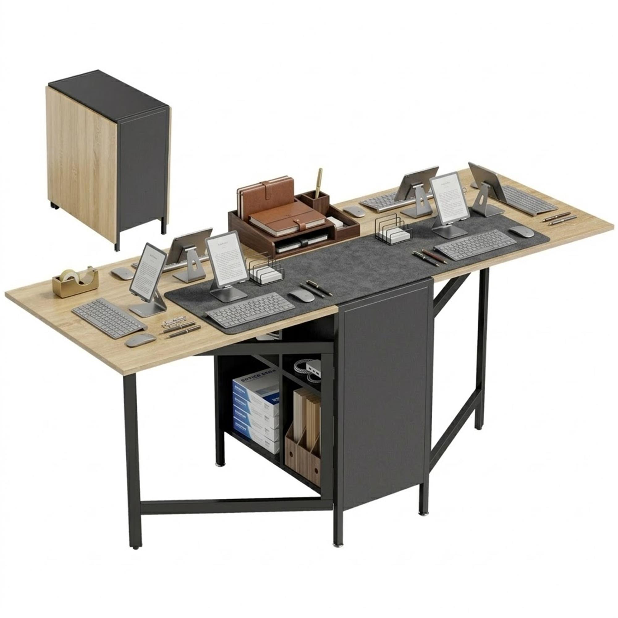 Questo tavolo è pieghevole da un lato o da entrambi e può assumere 3 diverse forme. Al centro sono inoltre presenti 4 comodissimi scomparti a forma di cubo che consentono di riporre archivi o accessori dell'ufficio consentendo di utilizzarle il tavolo anche come mobile contenitore aggiuntivo