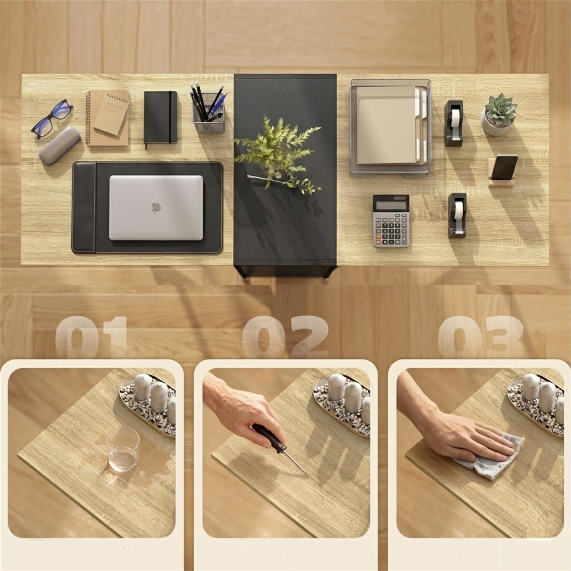 L'ampio piano d'appoggio è caratterizzato da una finitura effetto legno naturale di alta qualità, progettata per coniugare estetica e massima funzionalità: la sua superficie liscia assicura una manutenzione rapidissima, rendendola facile da pulire e resistente all'uso quotidiano.