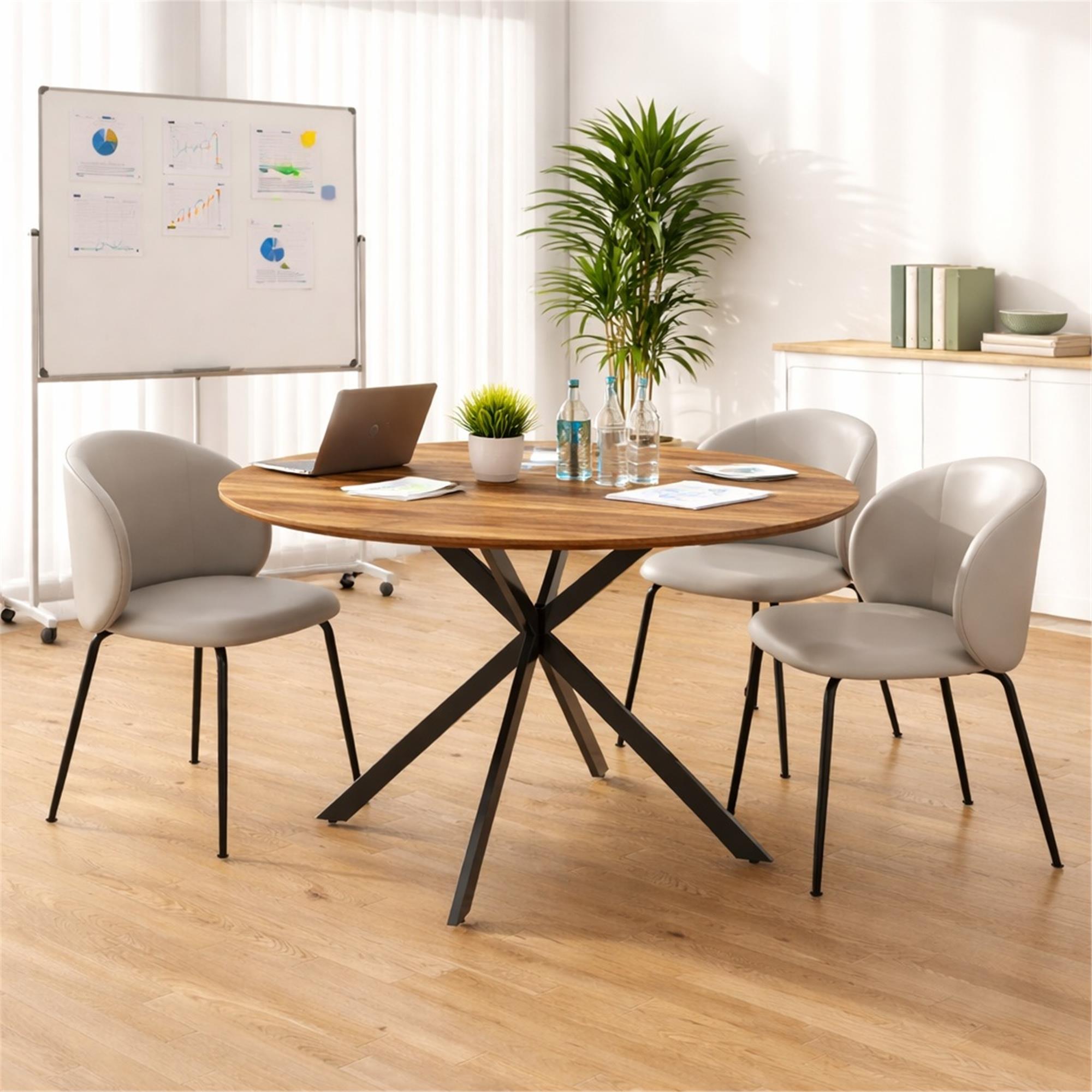A colpire e a dare carattere a questo tavolo sono le gambe incrociate in acciaio nero che conferiscono un deciso stile industriale. Questa struttura crea un piacevole contrasto con il ripiano effetto legno, rendendo il tavolo un vero punto di attrazione all’interno dell'ufficio o della sala riunioni.